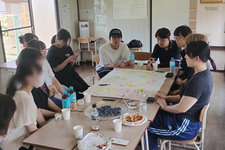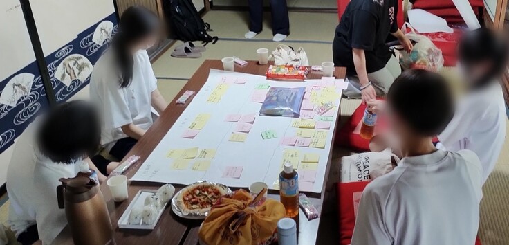 ゼミ生が床板貼りの合間をみて高校生と「ぴざらぼ」にて前回の話し合いをもとに意見交換を行い、「短期・中期・長期」それぞれの視点でできる取り組みや、たまり家の方向性についての確認・整理を行いました。