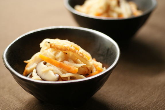 (切り干し大根と干ししいたけを使った煮物。和食の定番おかずですね。)