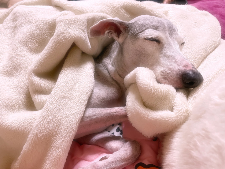 今日も落ち着かない様子で寝かしつけるのにだいぶ時間がかかりました💦以前までは夏でも毛布で砦を作ってまん丸で寝てましたが、今は毛布に入ってもすぐに出てきてしまい、ウロウロして忙しないです💧お医者さんからは呼吸が荒い時にはとにかく冷やしてあげるといいと言われてます。近所で向日葵畑が咲きはじめてて一緒に行きたいと思ったけど、炎天下は酷かな💦過ごしやすい時間を狙って一緒に見に行く事が出来たらいいなと思ってます🌻