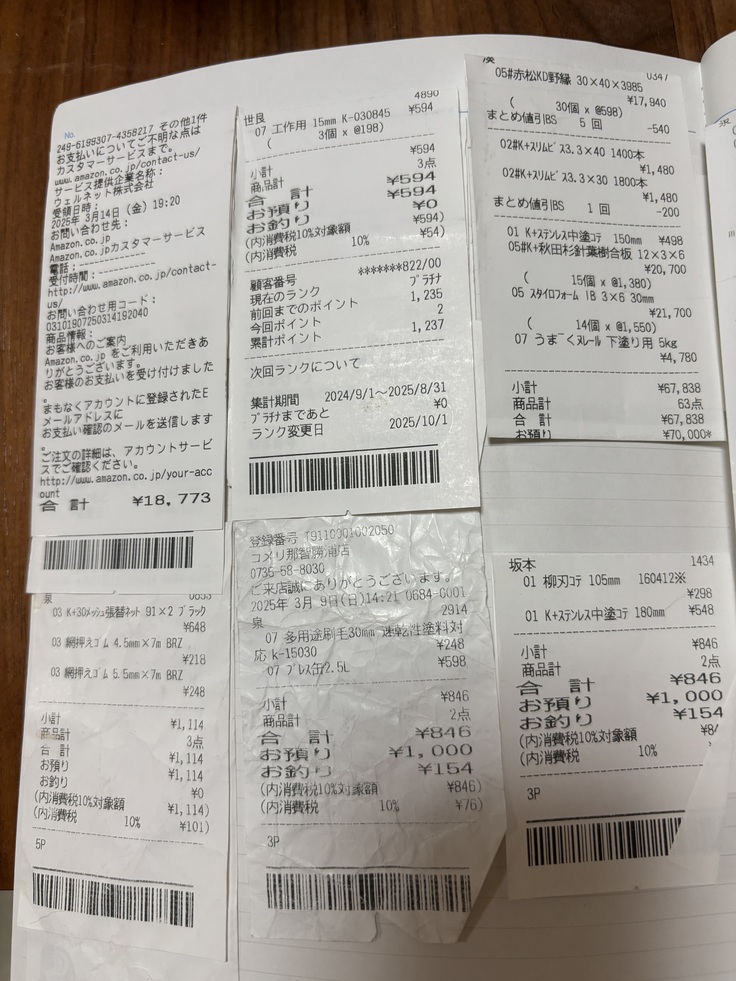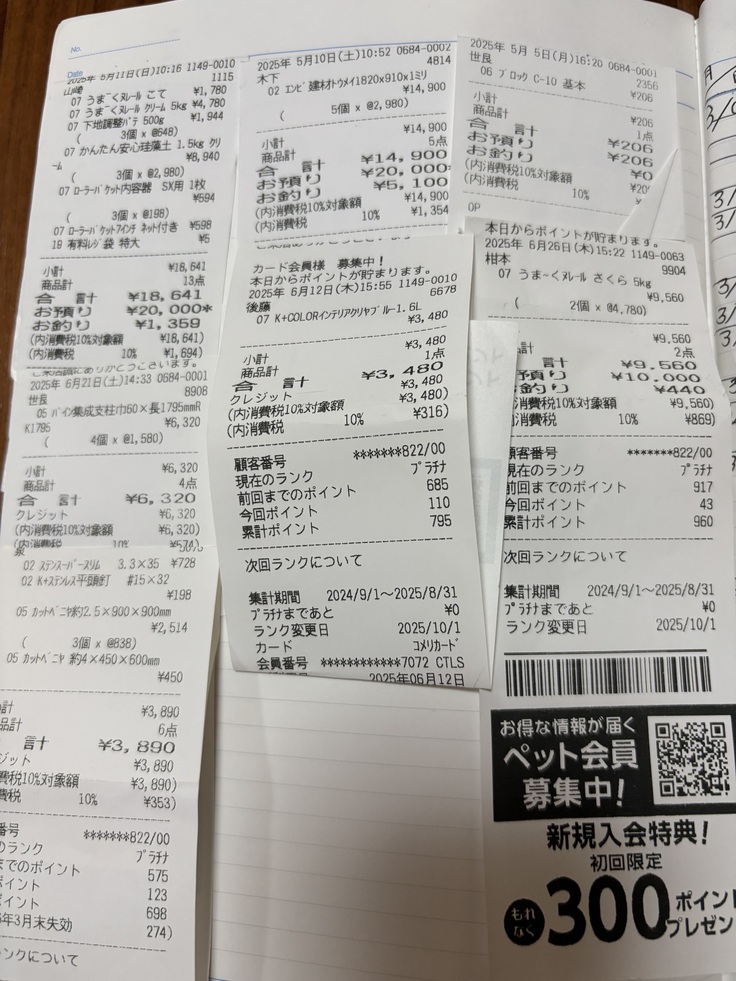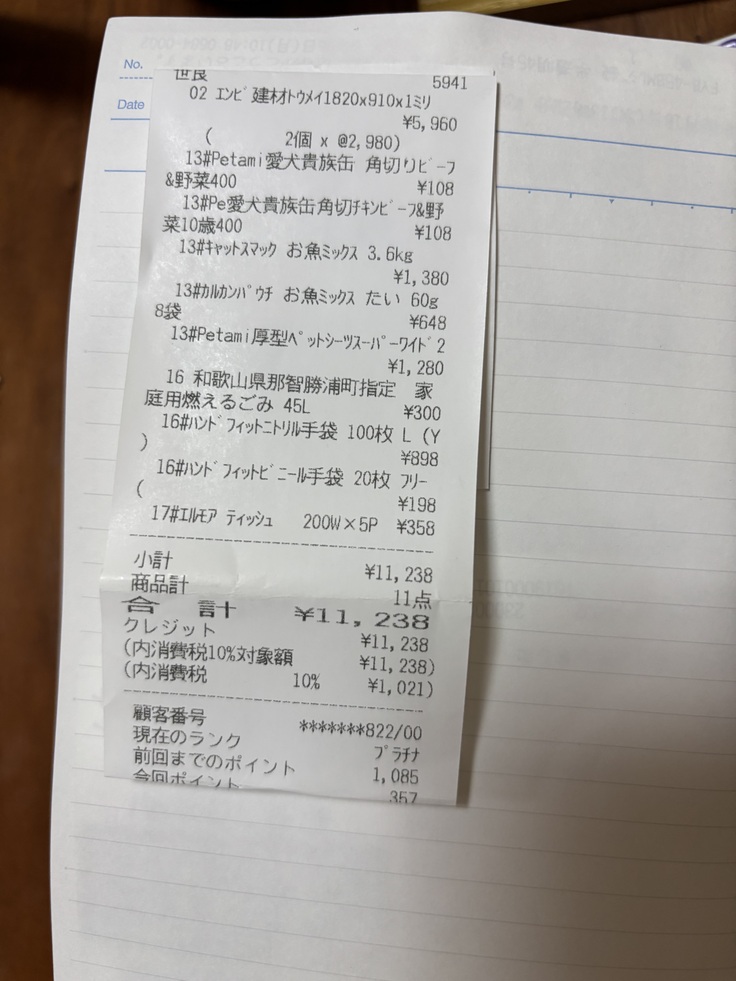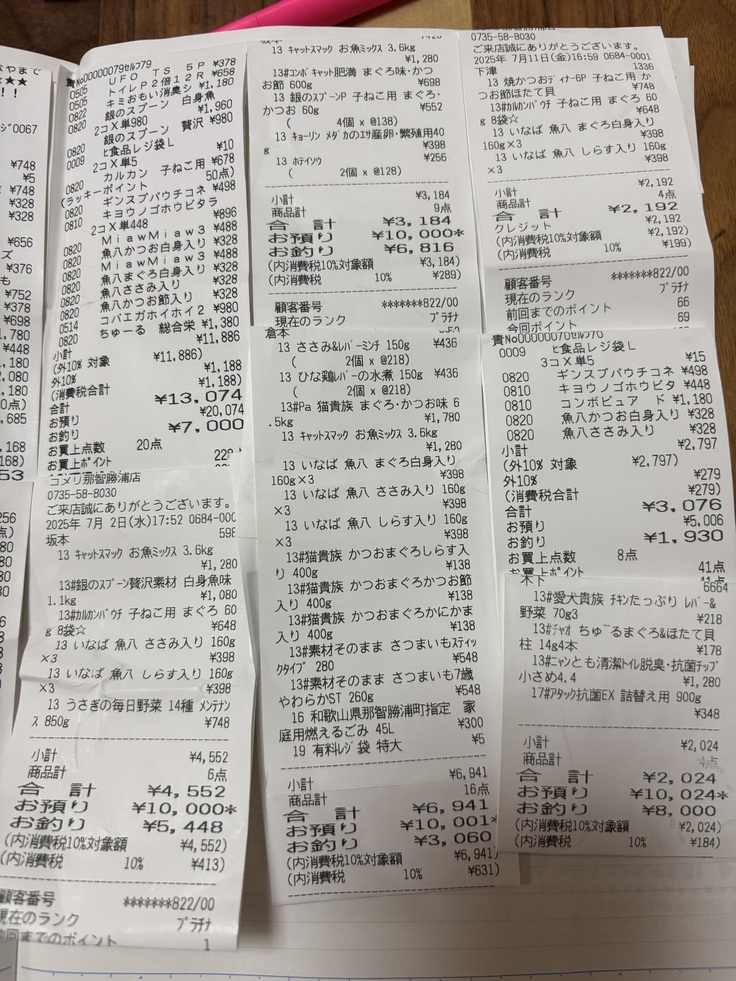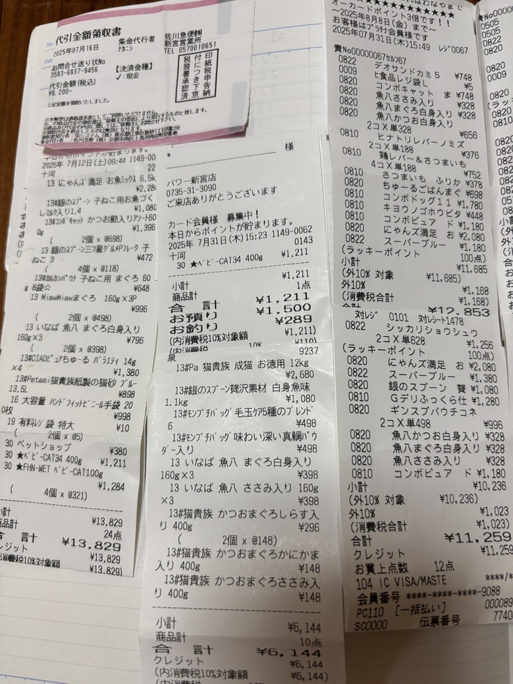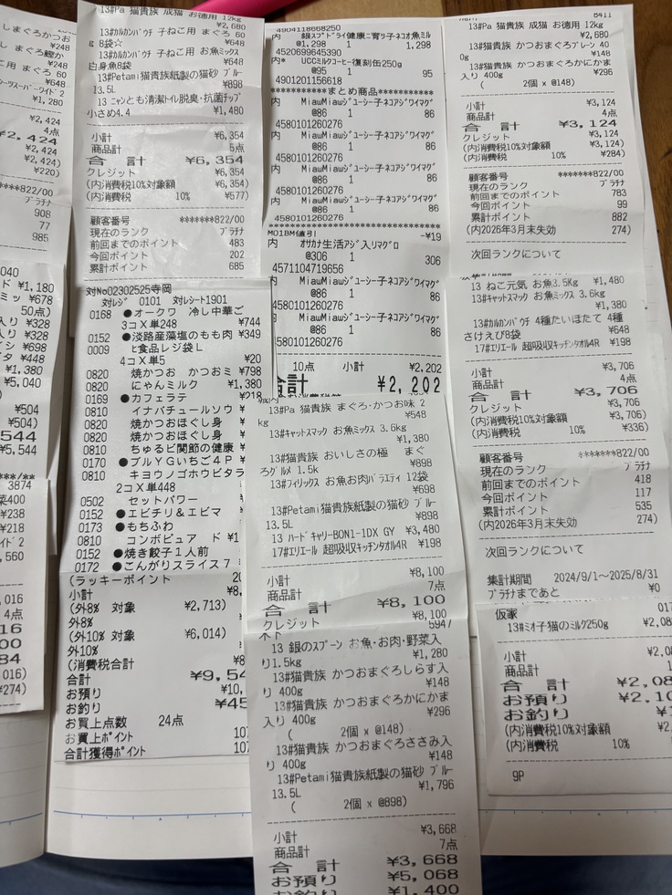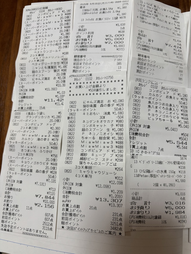犬猫達のフードやパウチおやつ、砂のレシートになります🐱訪問先物資も含む🐱