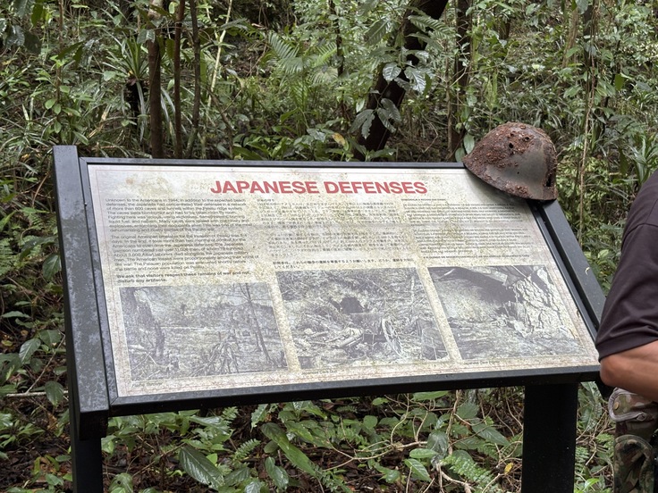 写真にも写っているように、道の途中には未だ不発弾が撤去されていない場所があり、小道には赤い柱の看板で注意喚起されています。また、中川州男大佐(歩兵第2連隊長)が率いたペリリュー島守備部隊の顕彰碑と多数の塹壕も見られました。四方八方に塹壕を掘ることで、山を登って攻めてくるアメリカ軍を包囲し、集中攻撃するためだったと言われています。それはまるで難攻不落の城のようでもありました。