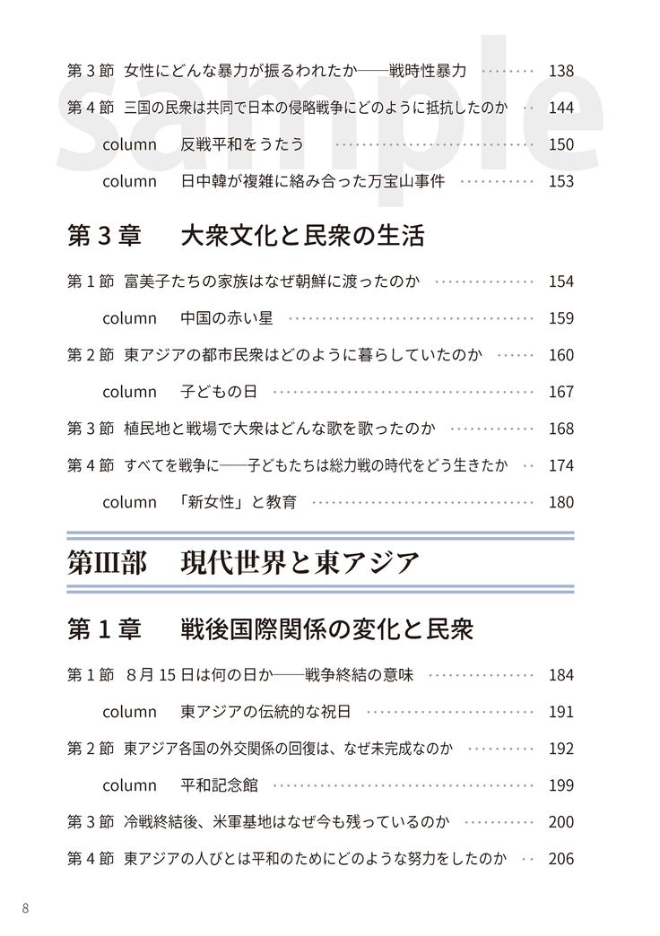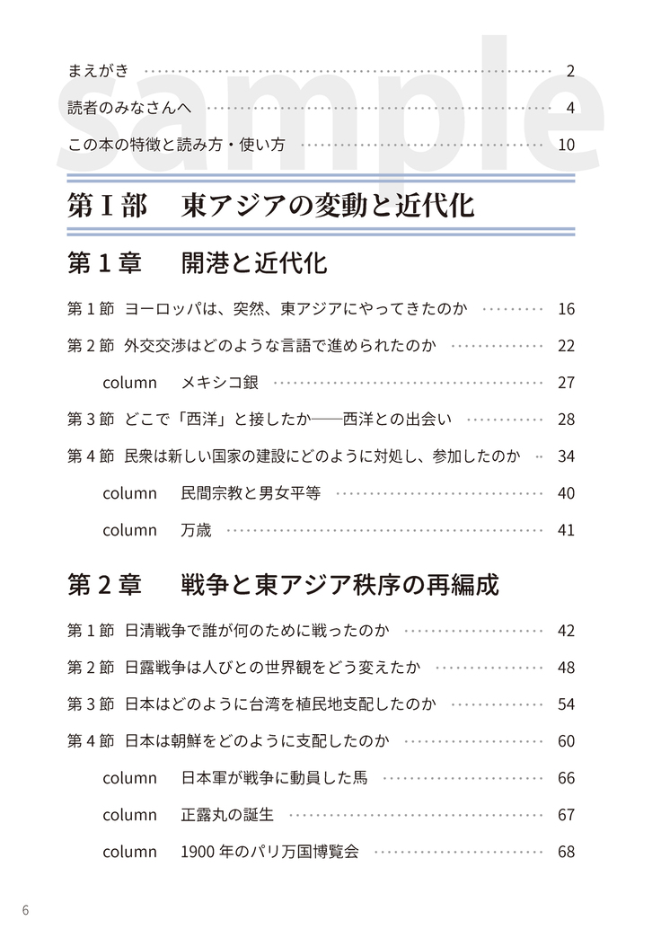 私たちは、過去の歴史を反省する視角に充ちた歴史教材であるこの本が、東アジアの歴史理解へのひとつの新たな窓口となり、読者のみなさんの考えを刺激し、知的な楽しみをかきたてていってほしいと願っています。同時に、読者のみなさんから様々なご意見やご提案をいただくことによって、さらに東アジアの歴史に対する認識を深め、東アジアの平和に向けた新たな歩みを推し進めたいと心から希望しています。