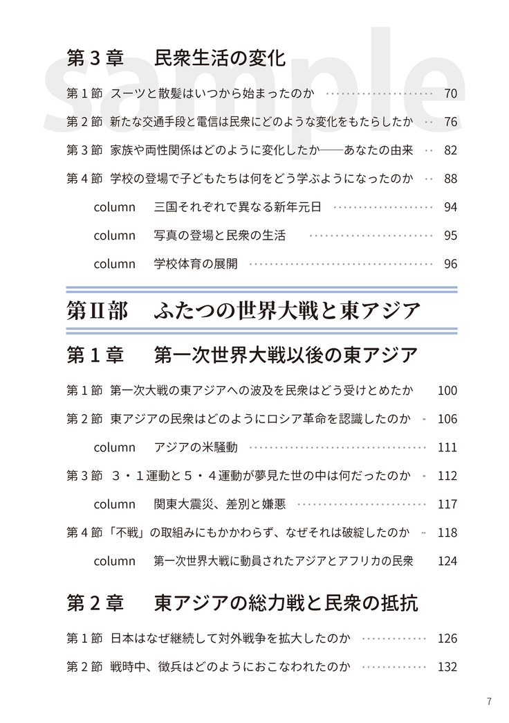 ①3部構成(第1部 東アジアの変動と近代化/第2部 二つの世界大戦と東アジア/第3部 現代世界と東アジア)とする。