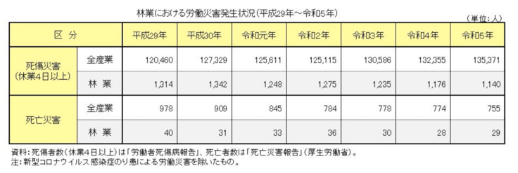 ・日本の国土の70%を占める山を守る林業事業者の死傷事故は、全労働者(1,000人率計算)中でワースト1の状況です。