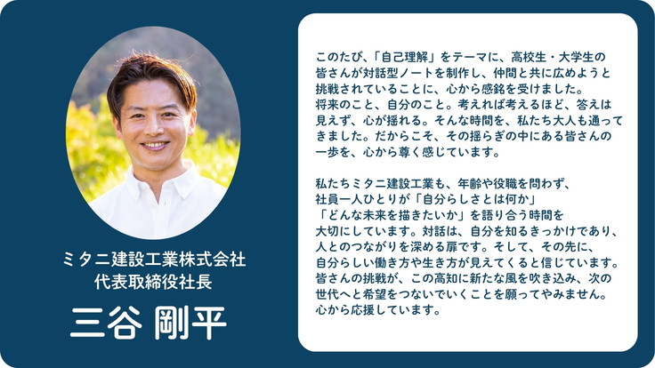 「こんなノートがあったらいいな」という想いを実現し、将来について考えることに悩んでいるより多くの中高生に届けられるように頑張っていきます。