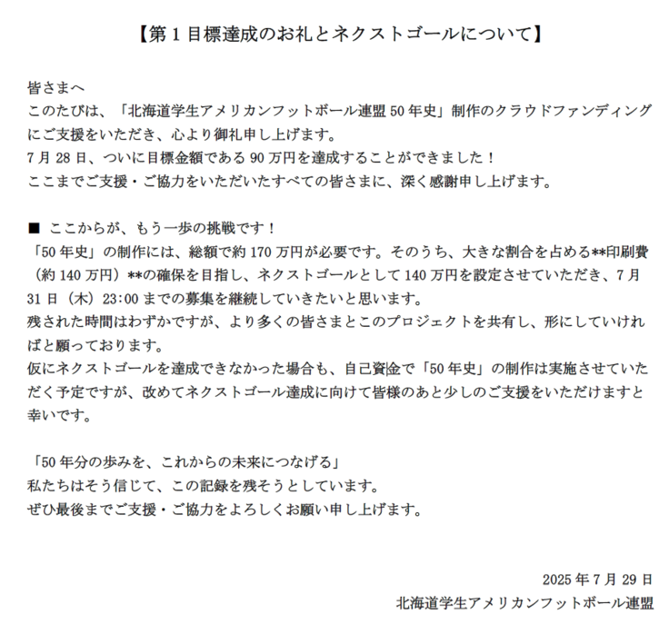 北海道学生アメリカンフットボール連盟が連盟創設50周年を記念して「北海道学生アメリカンフットボール連盟50年史」を発行し、販売する。その発行経費170万円(印刷140万円、郵送費15万円、その他諸経費15万円)に充てるため、多くのOB、父兄、ファン等に支援を呼び掛ける。