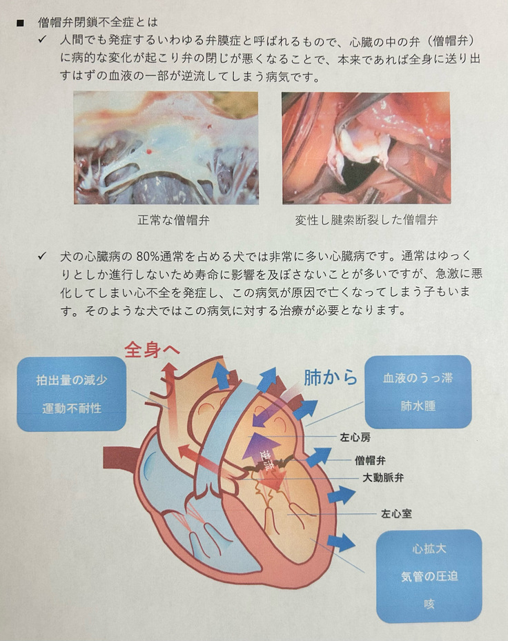 獣医師の説明では、心臓の僧帽弁が正常に閉鎖できなくなり、血液が逆流してしまう病気で、進行すると肺水腫などの心不全を引き起こすことがあるということでした。