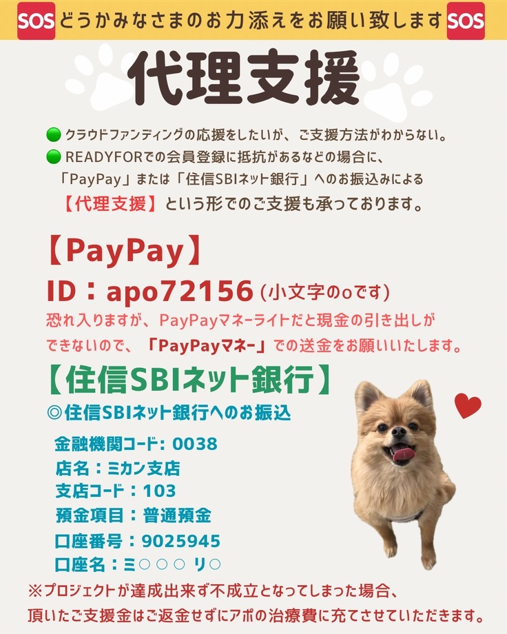 万が一アポが亡くなってしまった場合、いただいた支援金については返金はせずこれまでの治療費に当てさせていただきます。