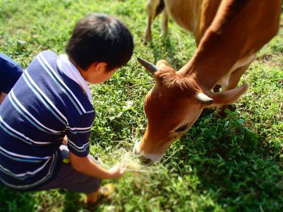 (地域の人たちが牧場に来て、牛たちとの触れ合い)