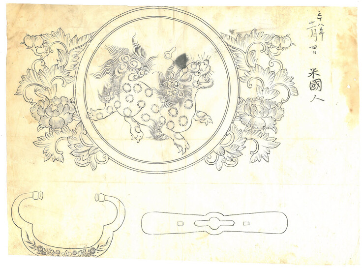 明治~大正期に仙台で活躍した金具屋・菊池家に伝わる図案帳。英語での説明や「米国人」などの記載があり、仙台箪笥が海外輸出されていた証拠となる貴重な資料です。絵師による美しい図案を金具職人が装飾用にアレンジして使用していたとされています。