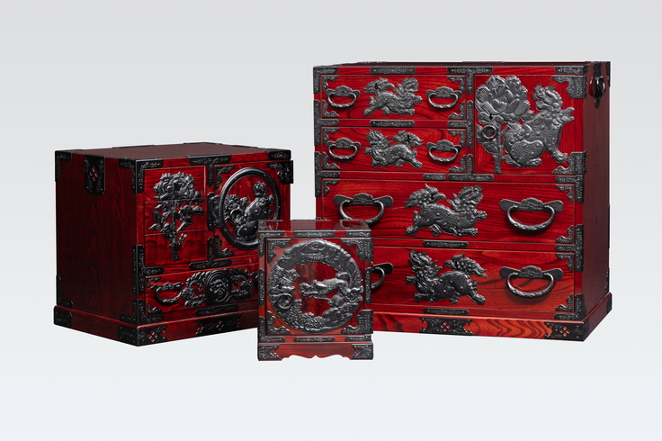 漆ならではの経年変化によって、時を重ねるごとに美しさが増していくのも大きな魅力です。 装飾金具には、「錺金具(かざりかなぐ)」と呼ばれる手打ちの鉄製金具が使われており、龍や唐獅子、牡丹などの縁起の良い文様が丁寧に施されています。