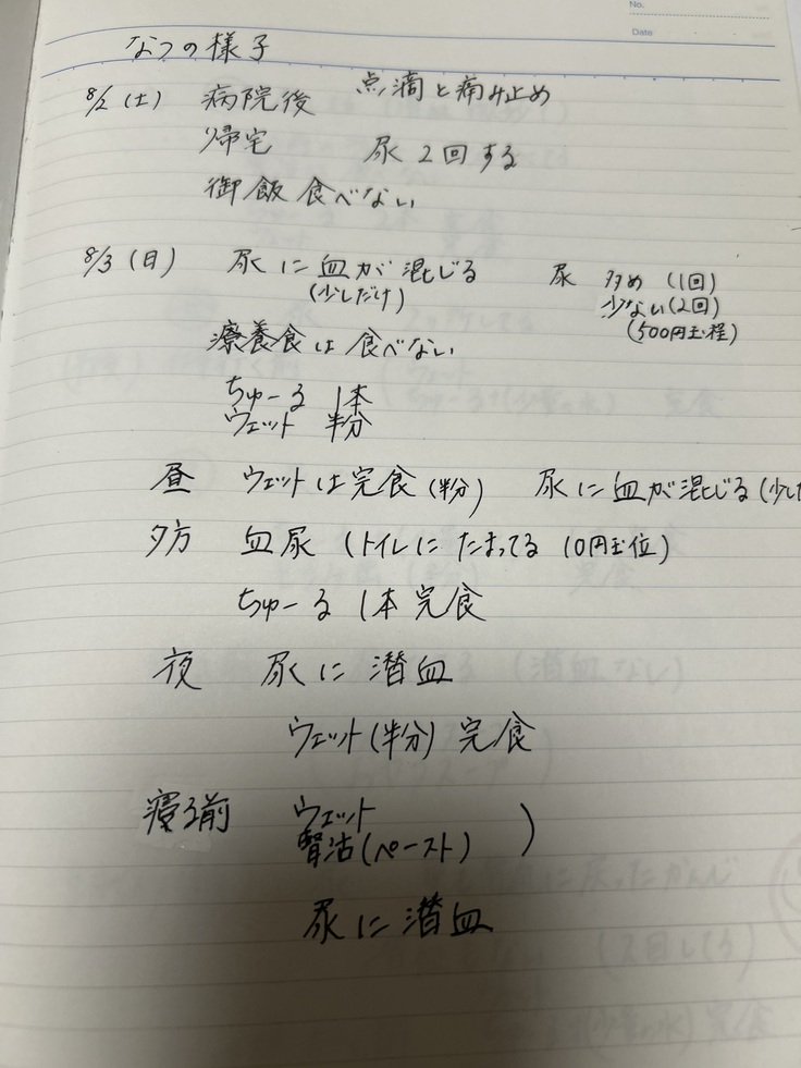 6日(水曜日)から 症状も落ち着いてきました。いっとき潜血まであったので 心配しましたが 後は ロイヤルカナン療養食を ちゃんと食べてもらって 結石なくなって欲しいな。