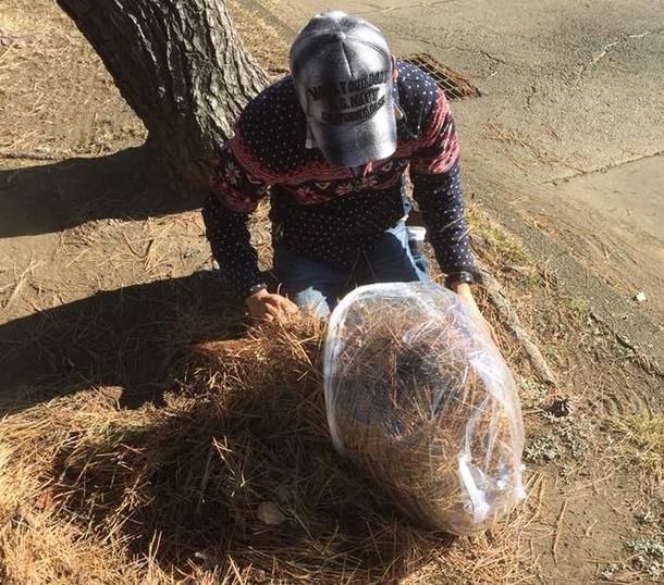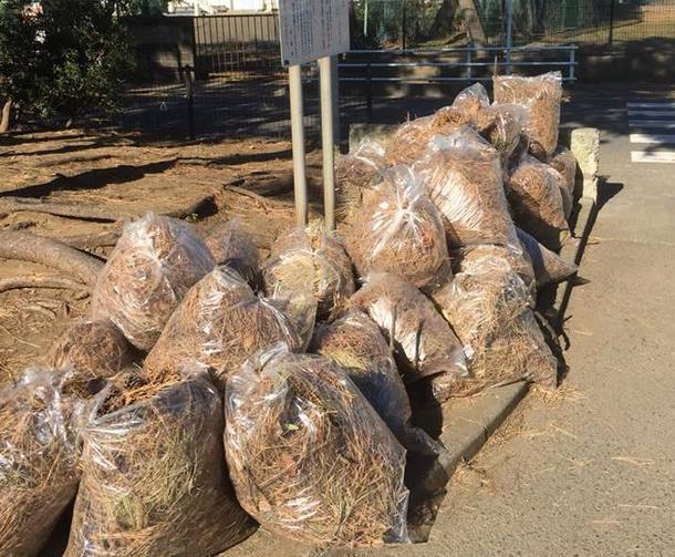 普段のゴミ拾いのほか、周囲を囲む松林の落ち葉を掃くという作業です。チクチク痛くて大変ですが、掃き集めて袋にいれる作業を、みなさん逞しくやってくれています。