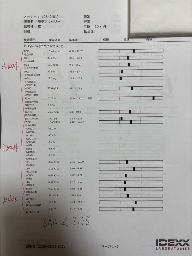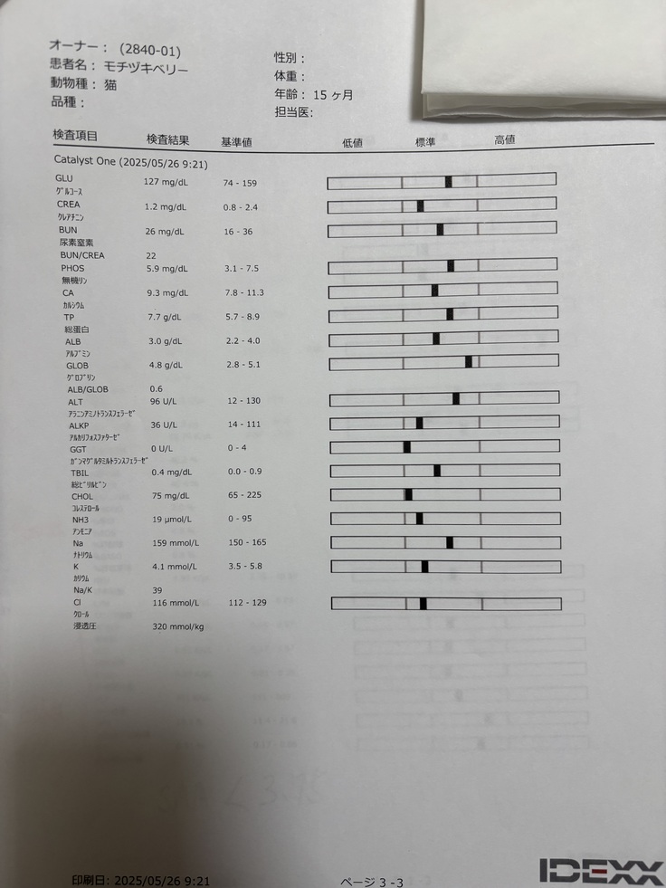 数日前から目から膿が出てしまい以前FIPで亡くなったココアの事を思い出し似たような症状だったので本日病院へ連れていきました。FIPの薬もあと2日分だったので。腹水の検査や血液検査を本日行いました。水もたまってなく血液検査も前回と比較しながら説明を。ほぼ標準値に。このままあと2ヶ月薬頑張りましょう。との事でした。体重も増えていて少しホッとしました。でもやっぱり薬はかなり高額で皆様ベリーを救って下さい。ご協力よろしくお願いします。