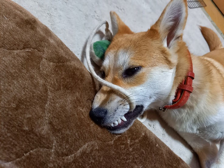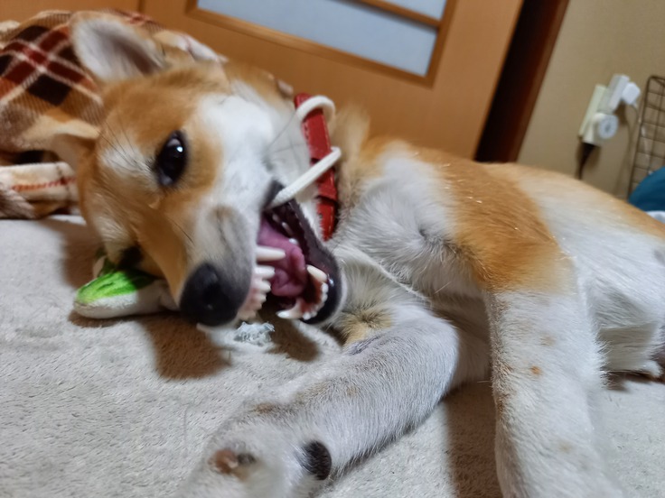 おもちゃ遊びも激しい。オオカミが獲物を引き裂くような遊び方で、普通の犬用のおもちゃはあっという間にボロボロになってしまいます。甘噛みも激しい。ただやんちゃで動作が激しいというだけではなく、とにかく気性が荒い。