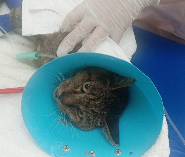 約1時間半後、桑原さんと診察室に呼ばれて入るとエリザベスカラーのボスが横たわり静脈点滴をして貰い身体も毛玉だらけでしたが綺麗にして貰っていました。