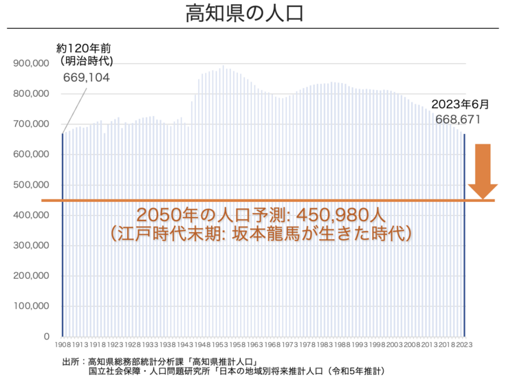 人口減少は日本全体に言えることではありますが、その中でも特に高知県の深刻さは他県を先行。このまま行けば2050年には江戸時代末期の人口まで減少すると予測されています。