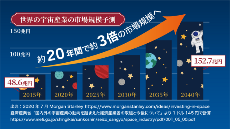 一方で宇宙産業は2040年には現在の約3倍の市場規模となる約150兆円と予測されています。近年、日本国内では多くの宇宙企業やベンチャー企業などが発足し、宇宙産業は国内でも投資が増加し官民から盛り上がりを見せている状況です。