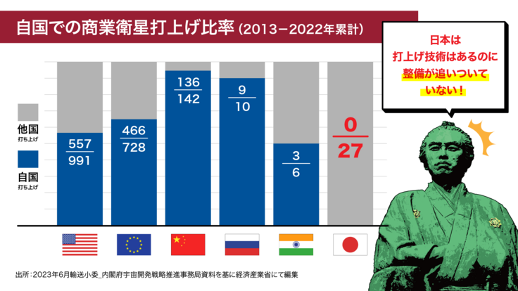 下記のグラフからもわかるように2013年から2022年の間に打ち上げられた日本の商用人工衛星27機はそのすべてが海外から打ち上げられています。