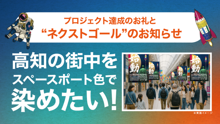 です。ネクストゴール目標金額は200万円(合計550万円)とします。スペースポートは地場に根付く産業で皆で作り上げていくものです。そのためにはまだまだ認知が足りていないと感じています。そこで、今年の夏から秋にかけて高知の街中をスペースポート色に染めたいと考えており、以下のようなプロモーションを考えています!必ず皆さんにワクワクしてもらえるような内容にします!