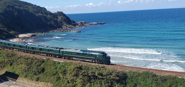 裏庭の広場からは日本海の絶景を望むことができ、海岸沿いをJR本線が走り、コバルトブルーの海と夕日、列車のコントラストが絶好の撮影ポイントで、鉄道ファンのみならず大勢の皆さまに見ていただきたい絶景スポットです。(Instagram:@yuhi_misumi)