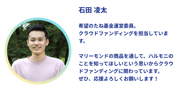 一般社団法人希望のたね基金は、グッズ製作販売事業「マリーモンドジャパン」にて、新デザインシリーズ「つなぐ」を立ち上げ、新商品を製作します。集まった資金240万円は、製作費(デザイン料込)205万円、クラウドファンディング手数料(税込)35万円として使用します。