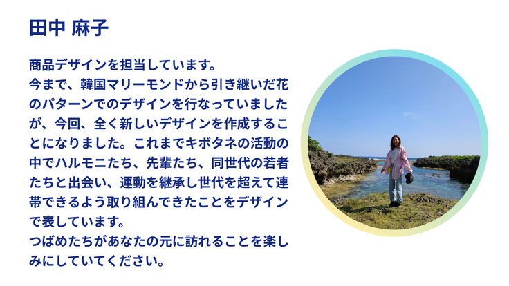 日本軍「慰安婦」にされた女性たちの尊厳を取りもどすために、彼女たちを象徴する花を選んで、その花をモチーフにしたデザインでアイテムを製造販売。