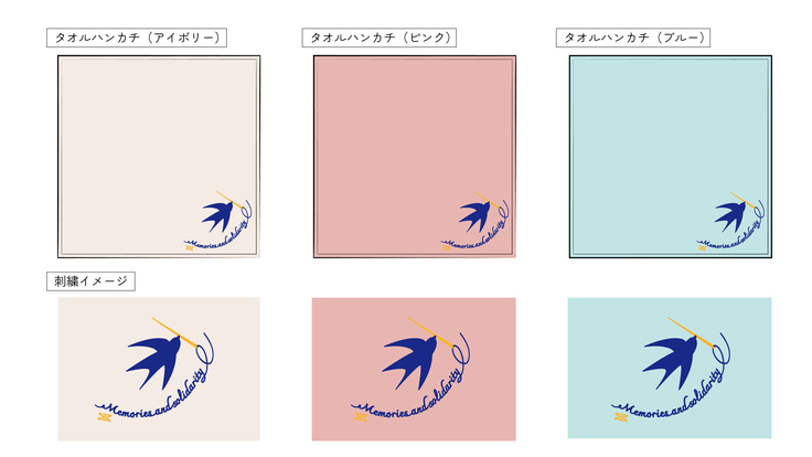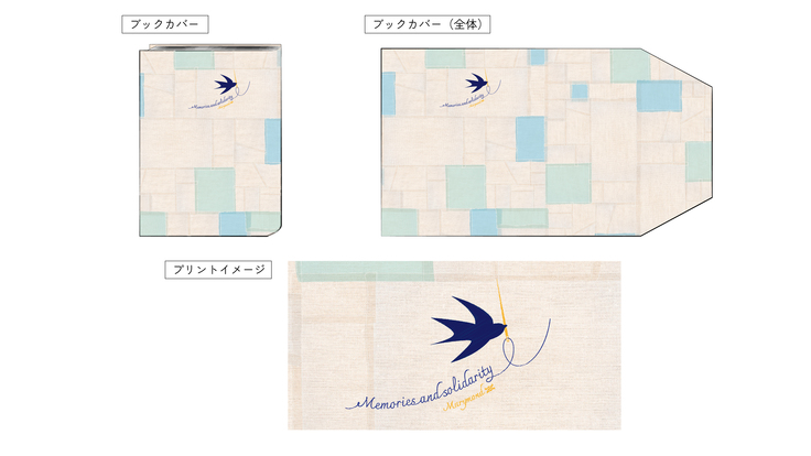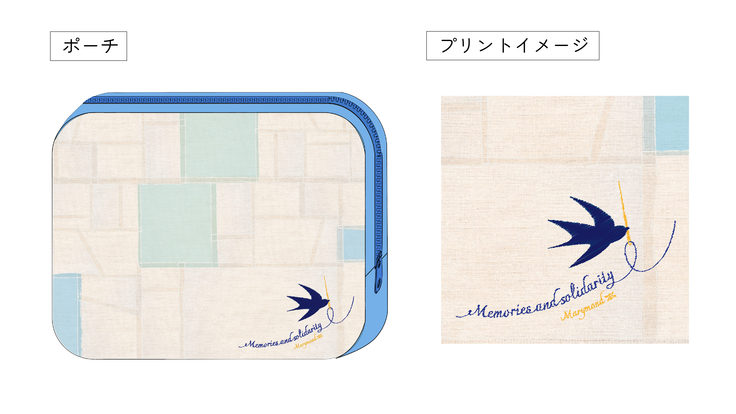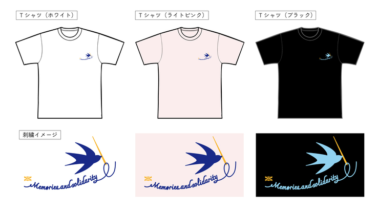 胸元につばめの刺繍と「Memories and Solidarity」のメッセージ、マリーモンドのロゴをあしらいました。