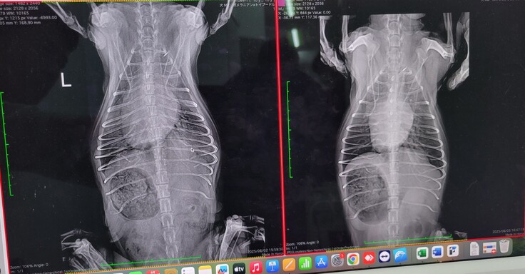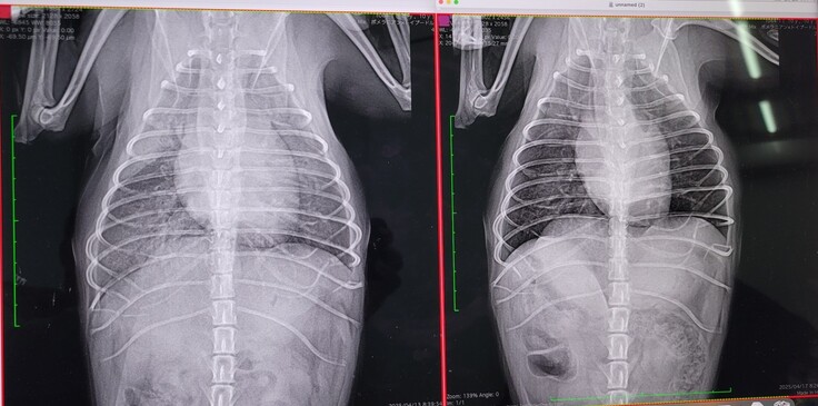 左が入院時・右が一週間後。心臓の周りのもやのようなものが肺水腫とのこと。一週間後には治まり、心臓の大きさも小さくなりました。