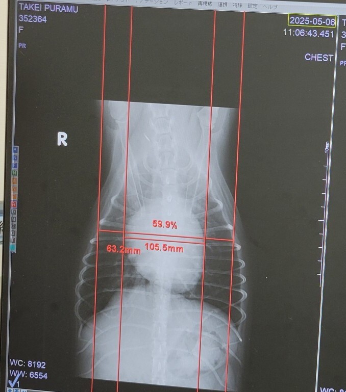 その後、失神を起こした後の状況。幸い、この時は肺水腫は再発していないようですが、退院時より心臓が少し大きくなっています。