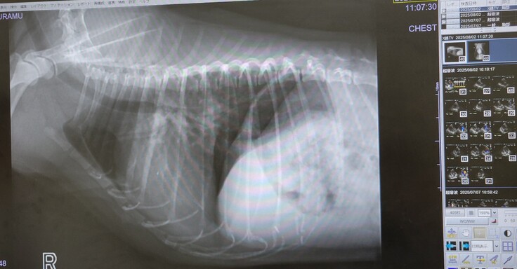 そして、かねてから心配であった咳の症状については、なんとレントゲン・エコー検査共に悪い部分が見当たらず問題なさそうで、手術時に横隔神経が一部麻痺となった部分の気管支に原因があると想定し、新たに気管支拡張の薬をいただき、経過観察することとなりました。