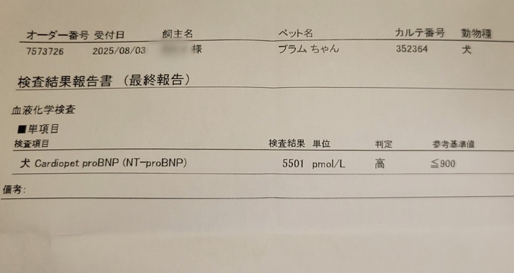そして、その日の朝には、以前書きました血液検査の項目の1つである「NT-proBNP」という値が異常値であったことから、これまでの去痰剤ではなく利尿剤を処方いただき、これからはこちらで様子を見ることとなります。