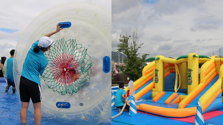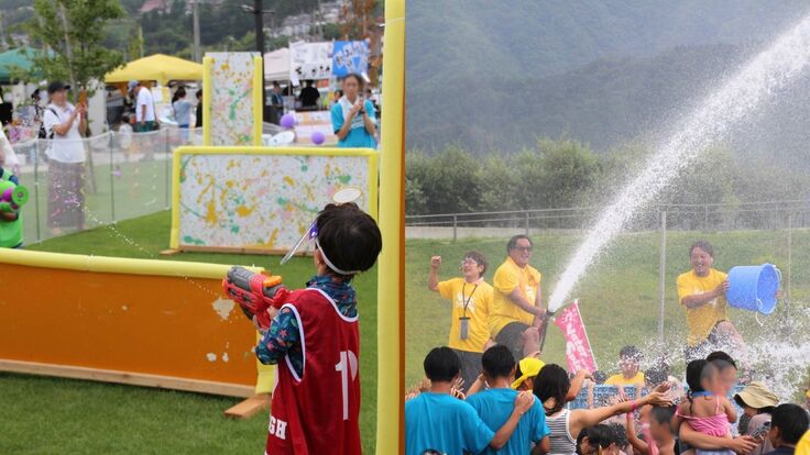 「Water Splash!」は、大型のウォーターアトラクションを中心に、水を使って全力で遊べる地域密着型の夏のイベントです。子どもたちが安全に楽しめるよう、大船渡中心市街地の広場に幅10m・長さ15mの巨大プールやウォーターホイールなどを設置。水鉄砲を用いたサバイバルゲームや、特設ステージを使ったイベントもあり、暑い夏を吹き飛ばす最高の一日を提供します。また、当日は軽食を提供するキッチンカーや動物と触れ合うコーナーもあり、家族みんなで楽しめる夏祭りのような雰囲気を味わえます。
