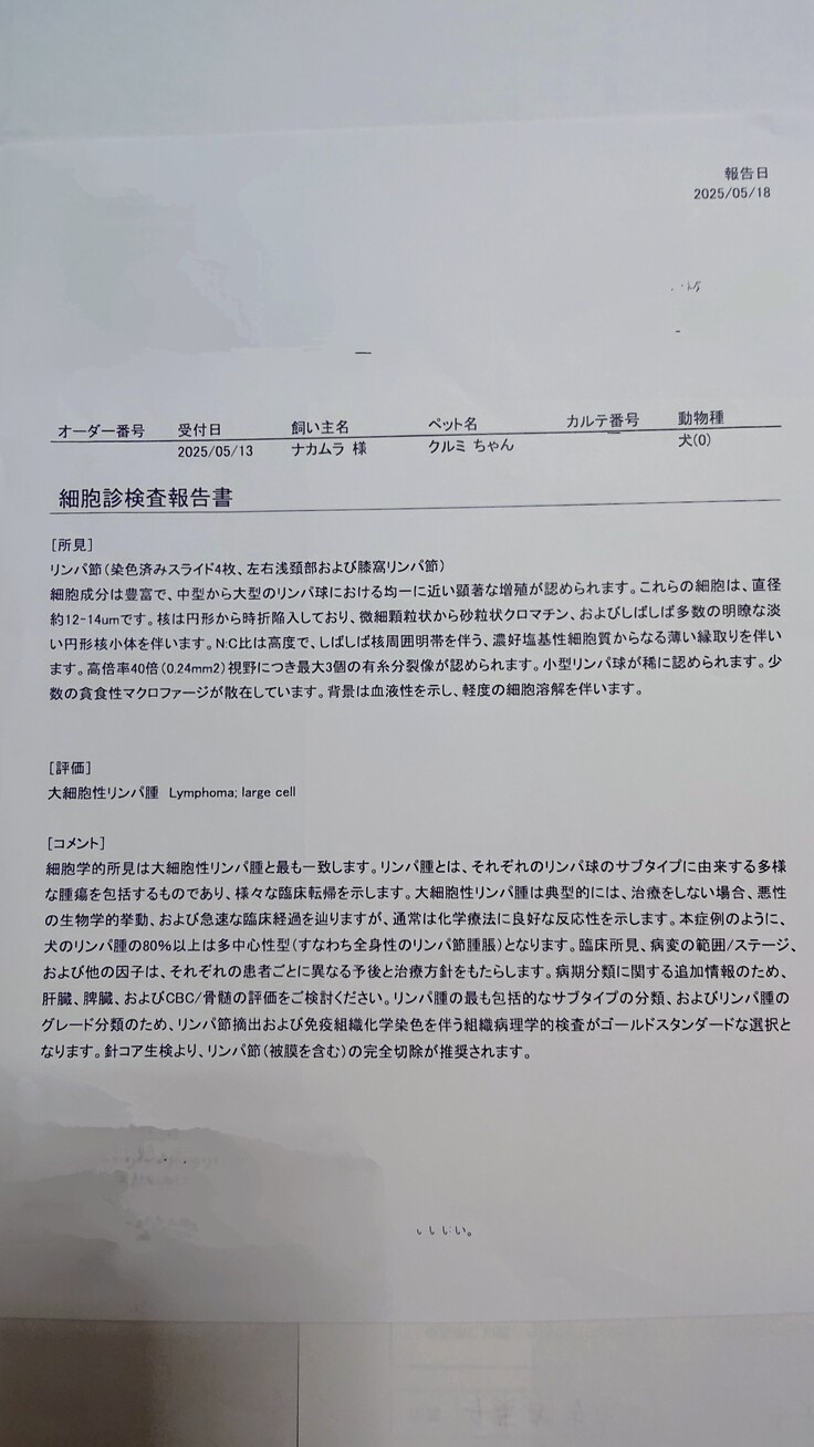 5月18日に検査結果がでて大細胞性リンパ腫(多中心型リンパ腫)と判断されました。