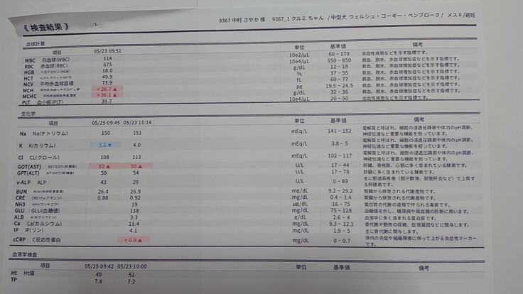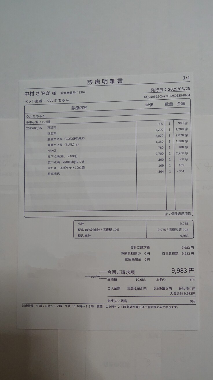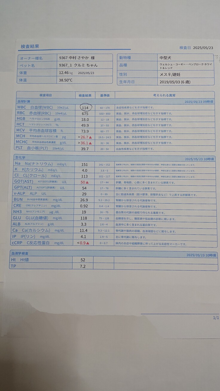 5月11日に動物病院に行き診察していただいたところリンパ腫の可能性が高いと言われ血液検査、(白血球の検査)をしてもらい結果は1週間くらいかかると言われました。