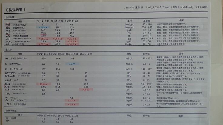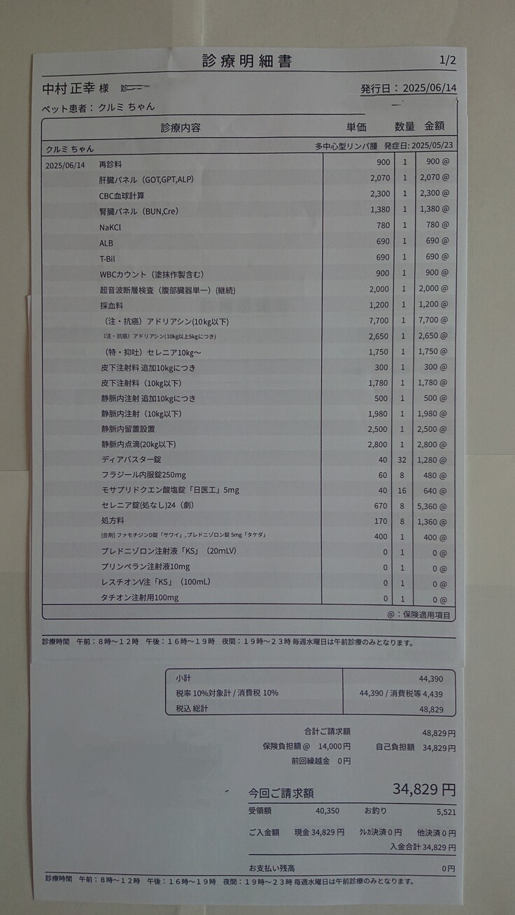 朝、お願いして夕方、迎えにきて治療は上手くいったと言われて安心したのですがクルミは貧血気味と今回の抗がん剤治療は副作用が5日後くらいからでるかもと言われ、安心できない日々が続くと思われますがクルミも治療頑張ってるのだから飼い主としても頑張っていかないとと思います。