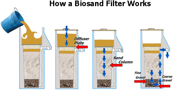 フィルターの効果の鍵となるのは、砂の表面に自然に形成される「生物層」です。この層は、有害な細菌や病原体を捕食・分解します。 水が砂層を通過する過程で、以下のような浄化作用が働きます。