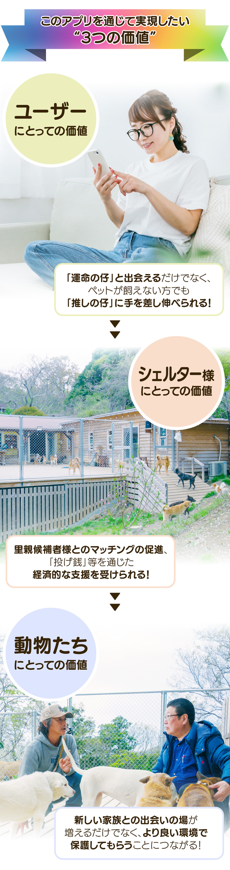 私たちが開発するアプリは、そうした仕組みを作るために、支援者様とシェルター様を直接つなぎ、「推しの仔」や「オンライン里親」という新しい支援の形を提案します。