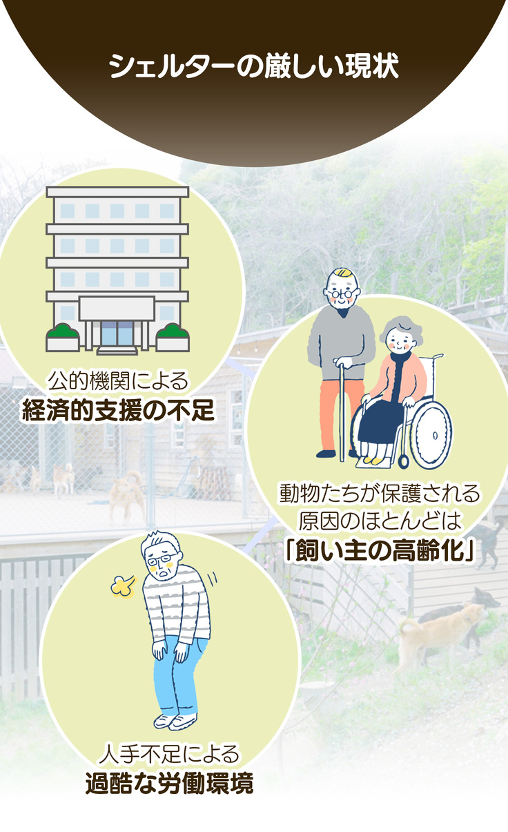 公的支援がほとんどないシェルターは、運営資金を寄付やボランティアに全面的に依存しており、常に“お金の問題”に頭を抱えています。