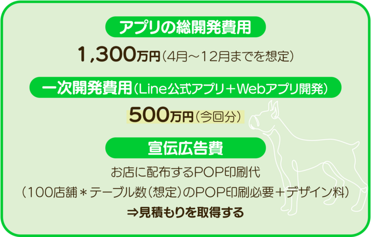 アプリの開発費用:1,300万円宣伝広告費:200万円今回のアプリの開発費用は、合計1,500万円に達する見込みです。