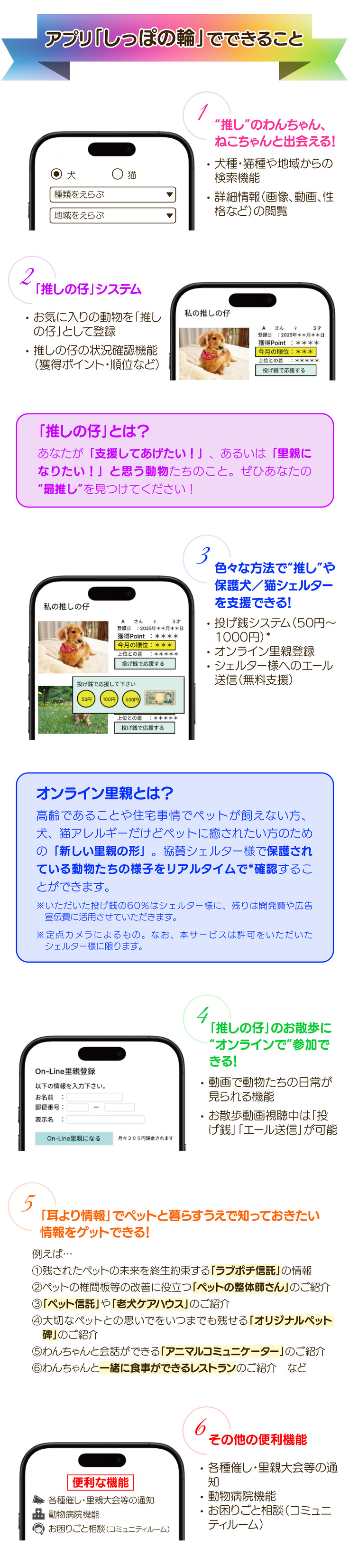 今回のアプリをはじめ、弊社の「しっぽの輪プロジェクト」では、保護犬・保護猫たちに新しい未来を届けるための活動を行っています。