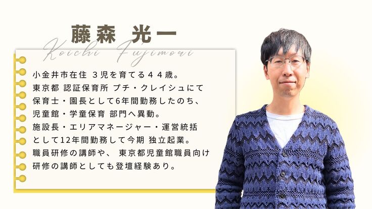 民間企業の保育士として、小金井プチクレイシュ、西国分寺プチクレイシュ(園長)、国分寺市立しんまち児童館(館長)、国分寺市立にしまち児童館(館長)など、小金井・国分寺エリアでは約10年ほど勤務してきました。