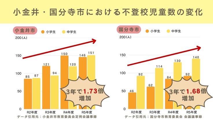 現在、小金井市の不登校児は約300名。国分寺市の不登校児は約230名。