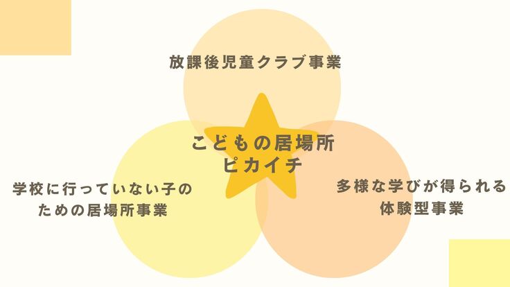 こどもの居場所ピカイチは、「不登校・学校行き渋りの子のための居場所事業」「放課後児童クラブ事業」「多様な学びが体験できる体験型事業」が一つになったこどもの居場所です。