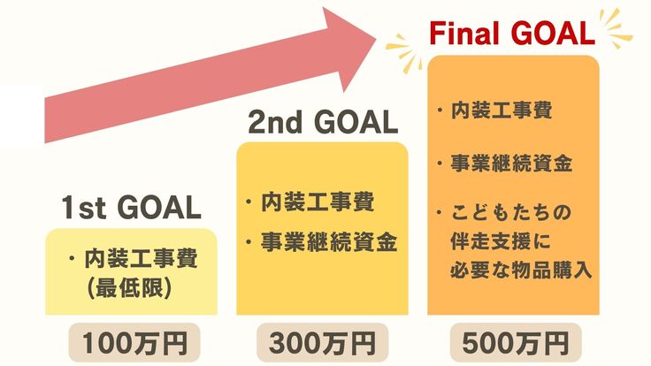 1st GOALを、内装工事費など設備投資にかかった金額の補填に設定し、2nd GOAL以降は事業の継続と運営環境の向上を図るための費用に充当する。