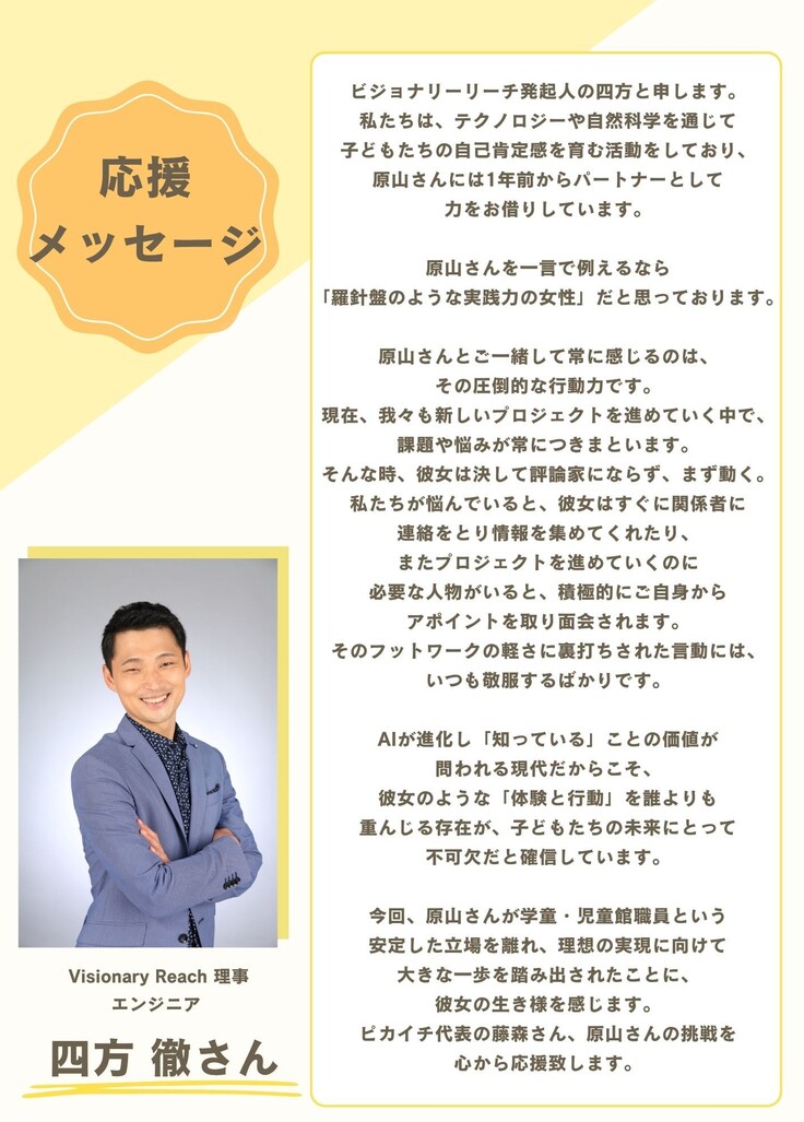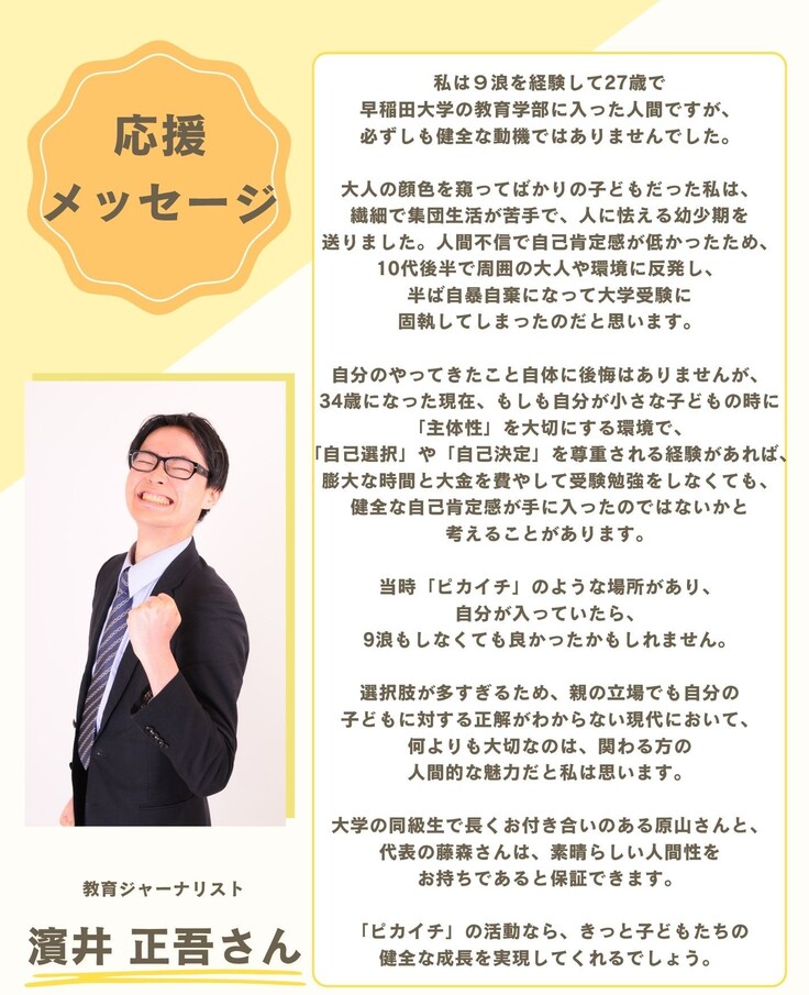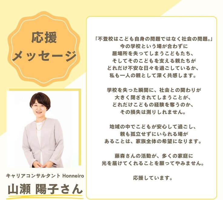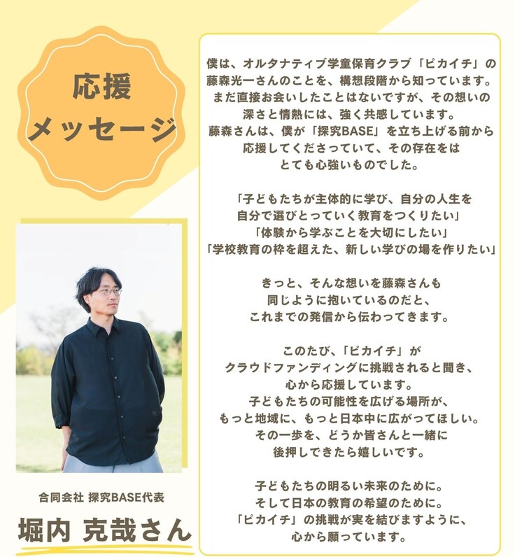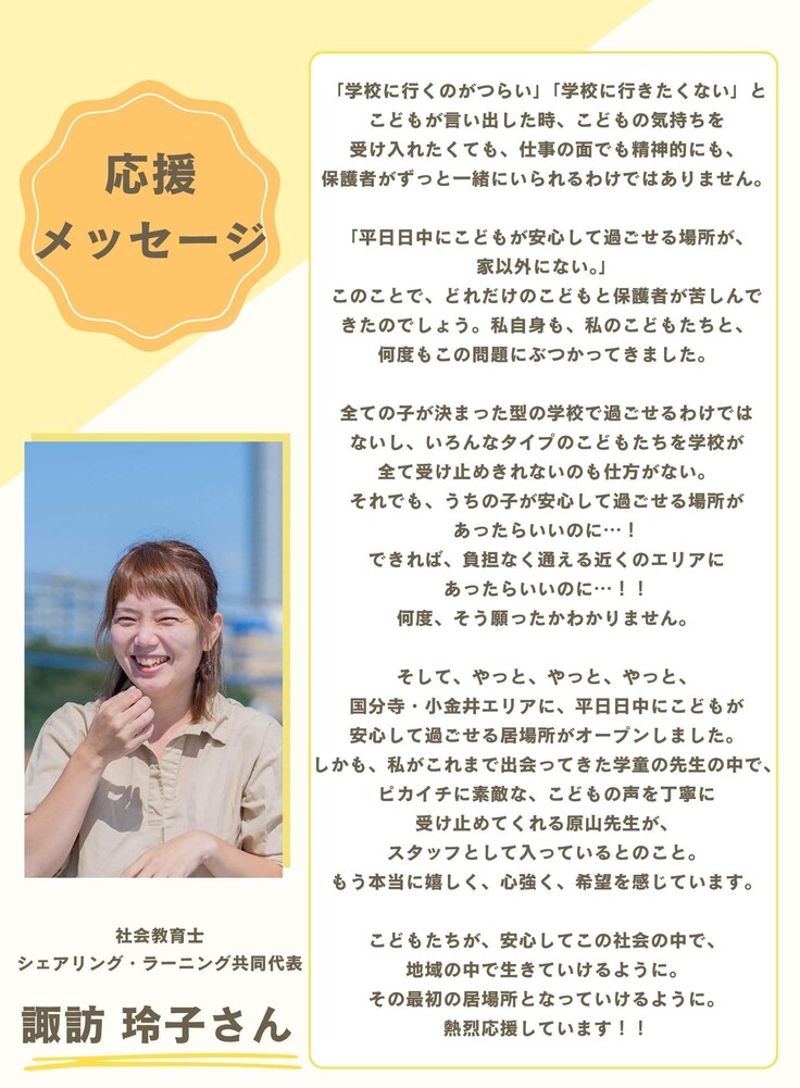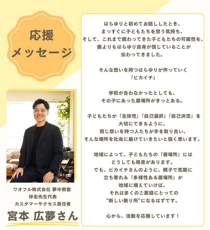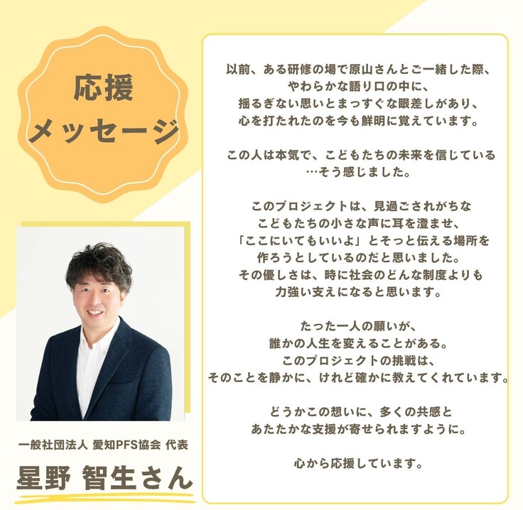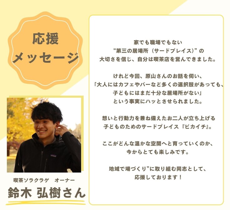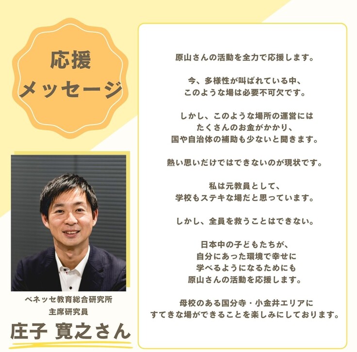 そこで藤森と出合い、彼の考える公教育やこどもの居場所に対する問題意識、そして思い描くビジョンに強く共感し、この4月から新たなこどもの居場所作りに共に取り組んでいく決意をしました。