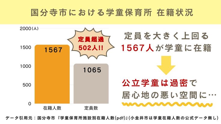 公立の学童保育所は、両市ともに1年生から3年生までなら全員入れる全入制というメリットがある一方で、大幅な定員超過で100名以上の子が利用する大規模化状態が何年も続いています。