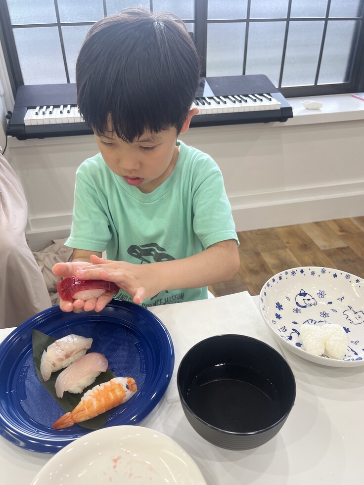 30分間ほど、紙粘土を使ってごはんを握る練習をしたあと、いよいよ本番として自分の食べるお寿司を握ってみました。みんな真剣な表情です。