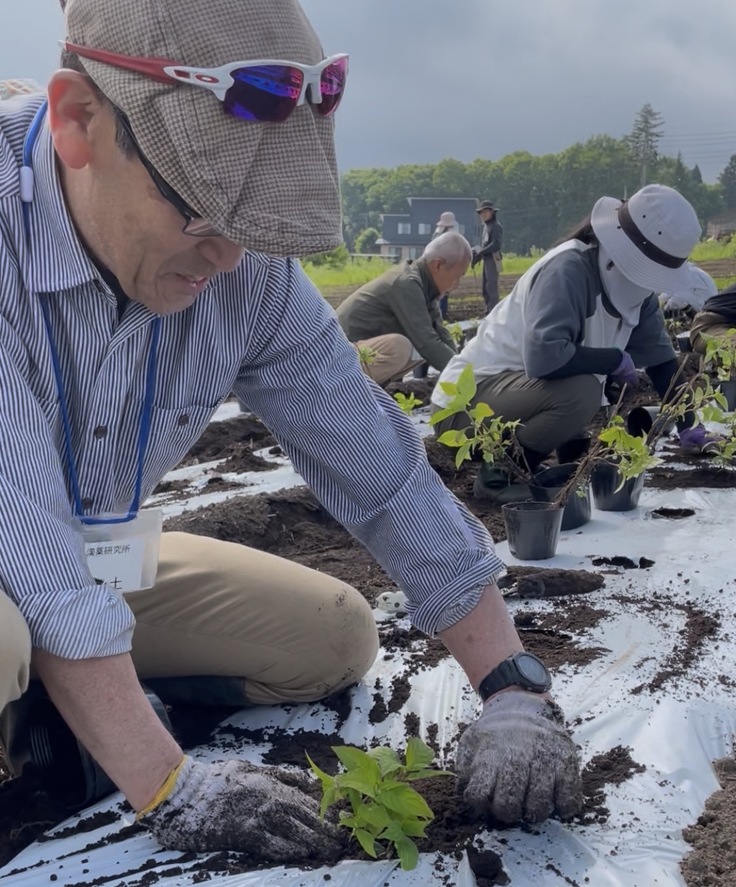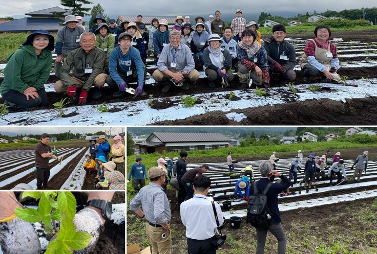 この取り組みには、生活クラブ生協の援農チーム「夢都里路くらぶ」、長野県内の薬草栽培農家や有志、当社社員など総勢約50名が参加し、開墾した遊休農地に手作業で一株ずつ丁寧に1,000株の苗を植え付けました。