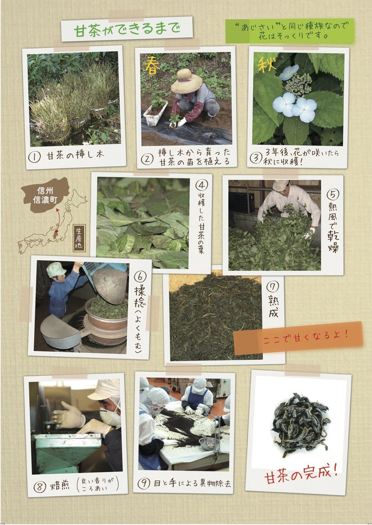 信濃町は、かつて「甘茶(あまちゃ)」の生産量が日本一を誇った町でもあります。歴史は江戸時代前期より始まり、冷涼な気候と冬の積雪がユキノシタ科の甘茶にはとても適していました。